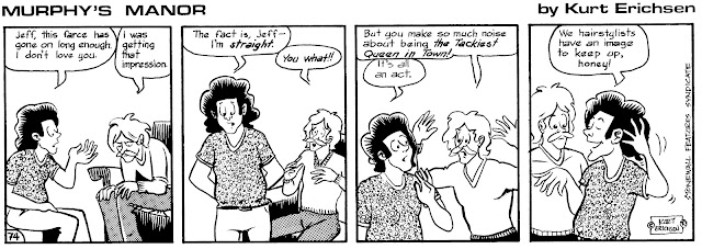 At the time I was working for a homophobic company by day, and at night going to PRO Toledo meetings, Coffees on Tuesdays, and drawing queer cartoons once a week. It felt like a double life. See my story "Saboteur" in Gay Comix #1!